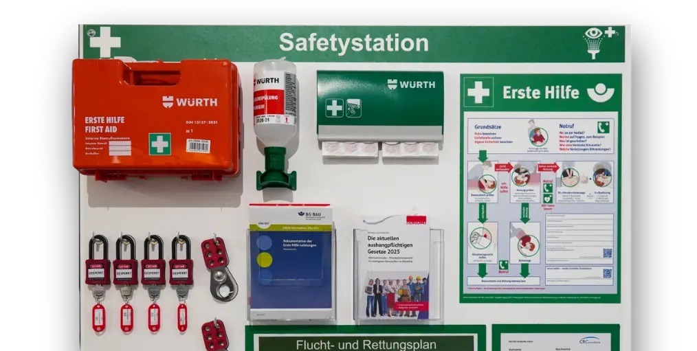 Im Notfall alles an seinem Platz: Erste Hilfe, Augenspülung, Pflaster, Flucht- und Rettungsplan – klar gekennzeichnet und jederzeit erreichbar.